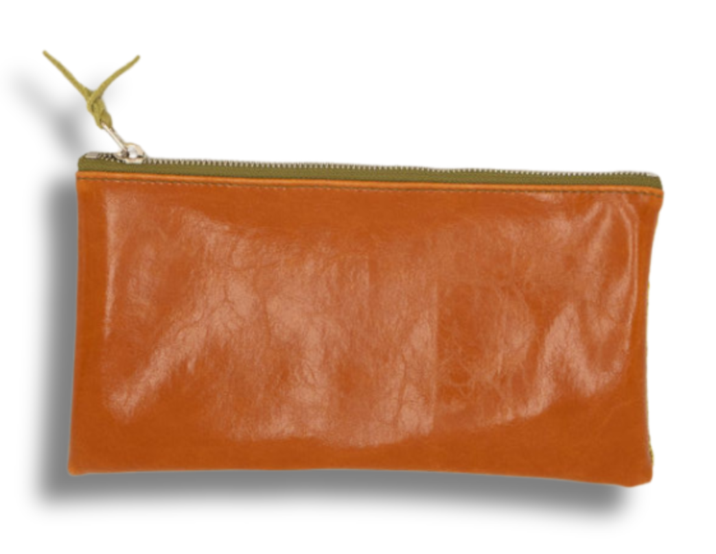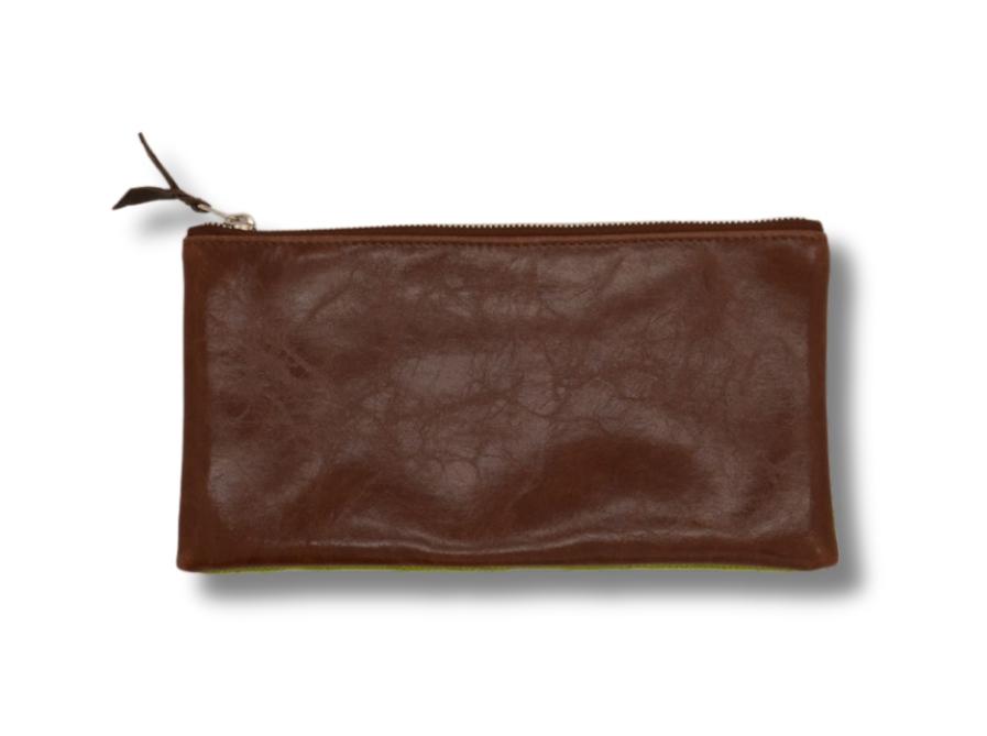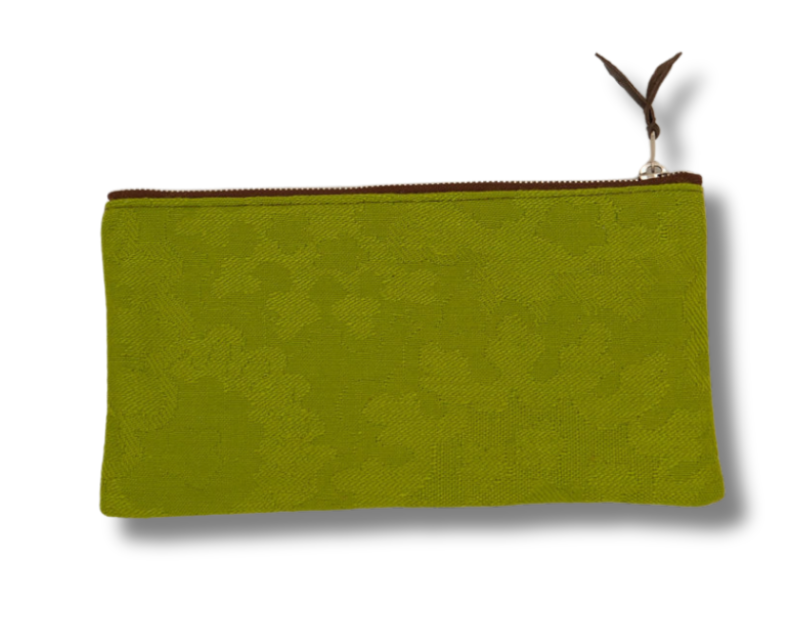 Green patterned zippered pouch on a light gray background