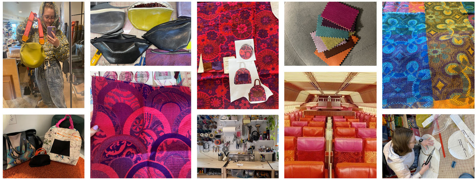 we discovered a beloved chapter of aviation history from the estate of a retired Boeing pilot: a veritable treasure trove of vintage upholstery fabric samples for airplane seats from the late 1960's and early 70's. These iconic textiles are our muse for our latest handbag collection.
