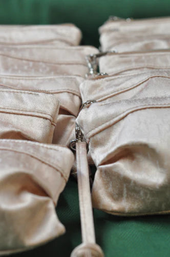 A bride asked us to incorporate the silk fabrics of her wedding dress,and infuse her wedding colors into one-of-a-kind custom clutches for each of her bridesmaids gifts.
