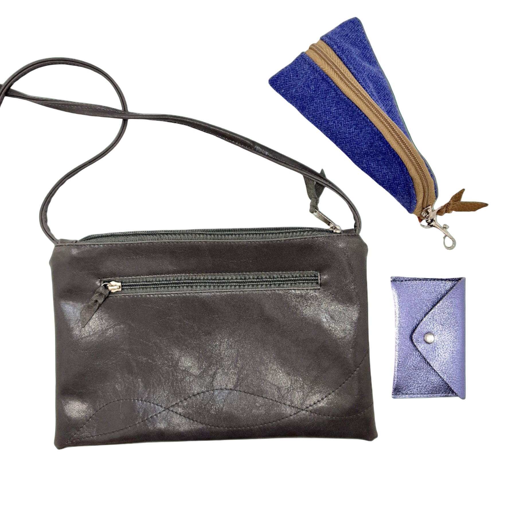 A refined, neutral-toned gift bundle featuring the Grey Bossa Nova Crossbody with coordinated accessories made from reclaimed textiles. Elegant, modern, and sustainably crafted.